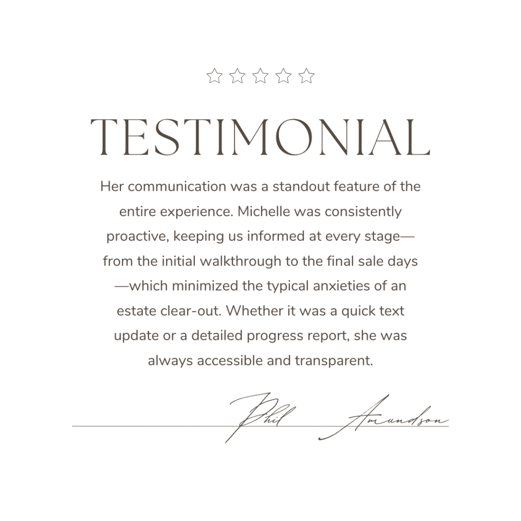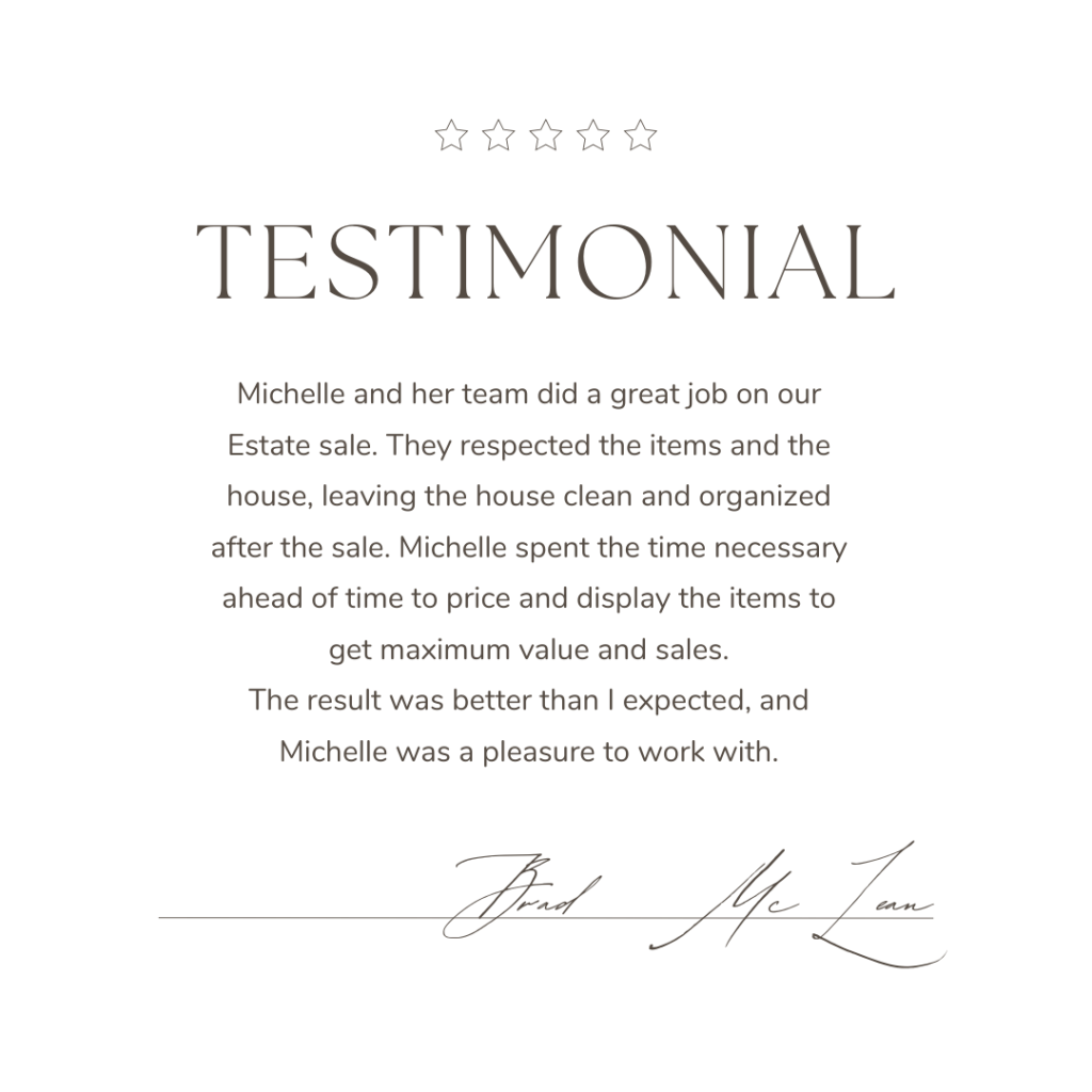 After over 20 years of experience as a social worker and serving as the executive director of a nonprofit, Michelle saw firsthand how difficult transitions could be on families, especially when dealing with the loss of a loved one. Her passion for estate sales began when she helped her own family navigate the difficult task of sorting through her grandfather’s vast estate. An avid antique collector, his home was filled with cherished relics. Later, she faced the challenge of helping her parents downsize, experiencing firsthand the emotional and financial weight of parting with a lifetime of memories. These experiences, combined with her professional background, inspired Michelle to start an estate sale business that blends compassion and expertise. With a deep respect for both the sentimental and financial value of family possessions, she built a service that families could trust to handle their transitions with care and understanding.